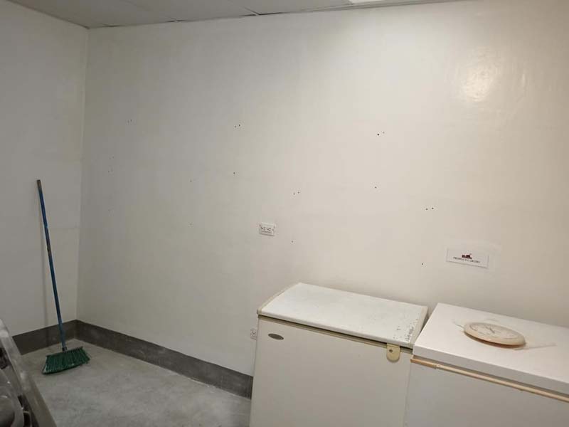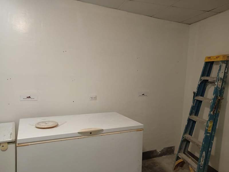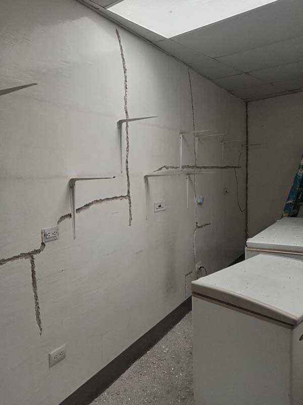 Remoción y reposición de recubrimiento epóxico en piso. Reparación estructural y superficial de grietas en muros de block, incluyendo resane, renovación de acabados y aplicación de sistema de pintura arquitectónica